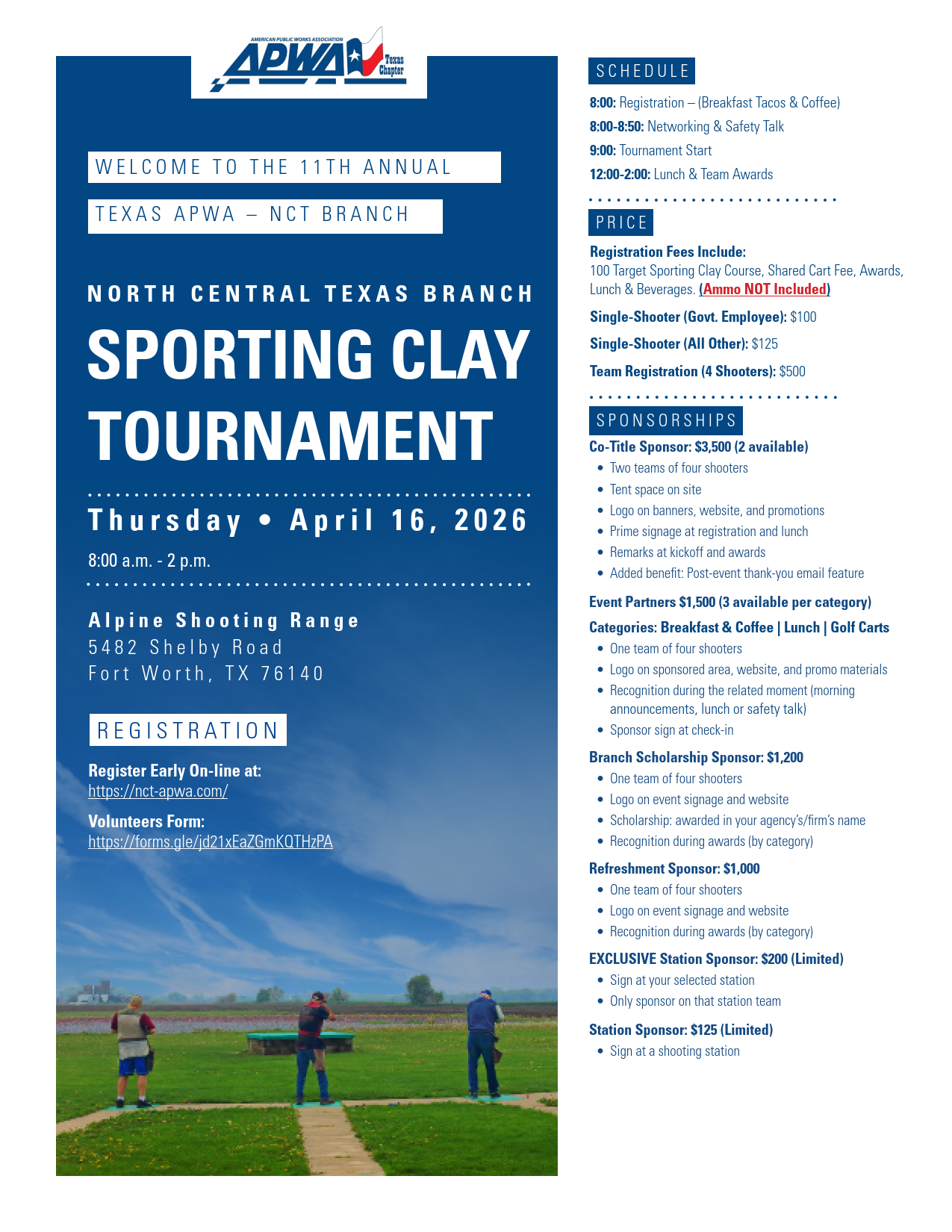 April 16th – NCT-APWA 11th Annual Sporting Clay Tournament